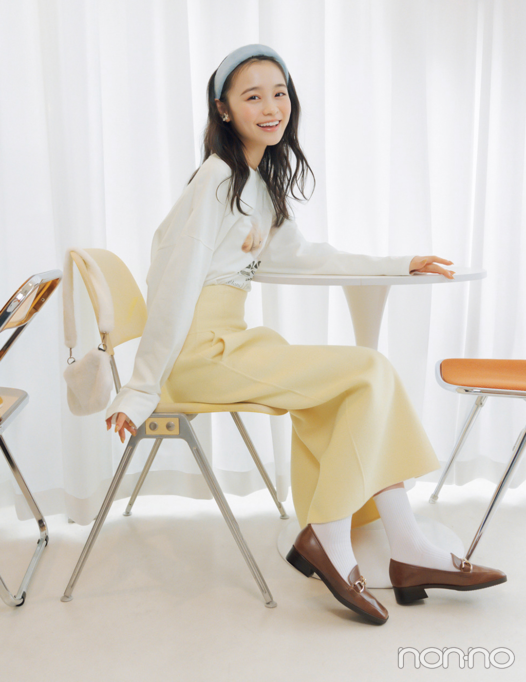 白のロンTとイエローのスカート。優しげ配色でまとめればカジュアルトップスも甘い印象に。足元はまろみカラーに似合って大人っぽさも盛り込めるブラウンのローファーを。着こなしの格上げにも最適。