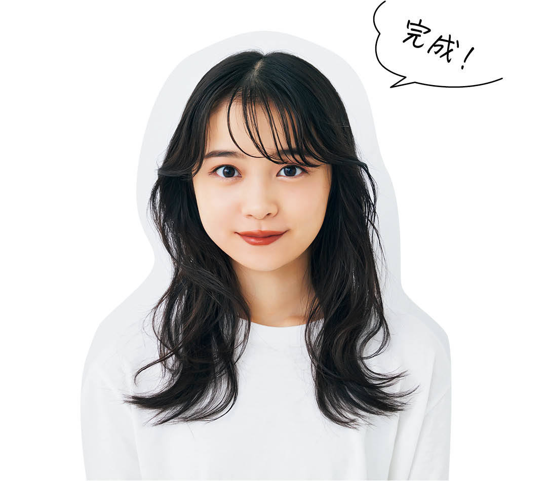 適量のバームを髪全体にもみ込んで、巻いた束をラフに崩す。指先に残った少量を、顔回りとくびれの毛束になじませながら形状をFIX。