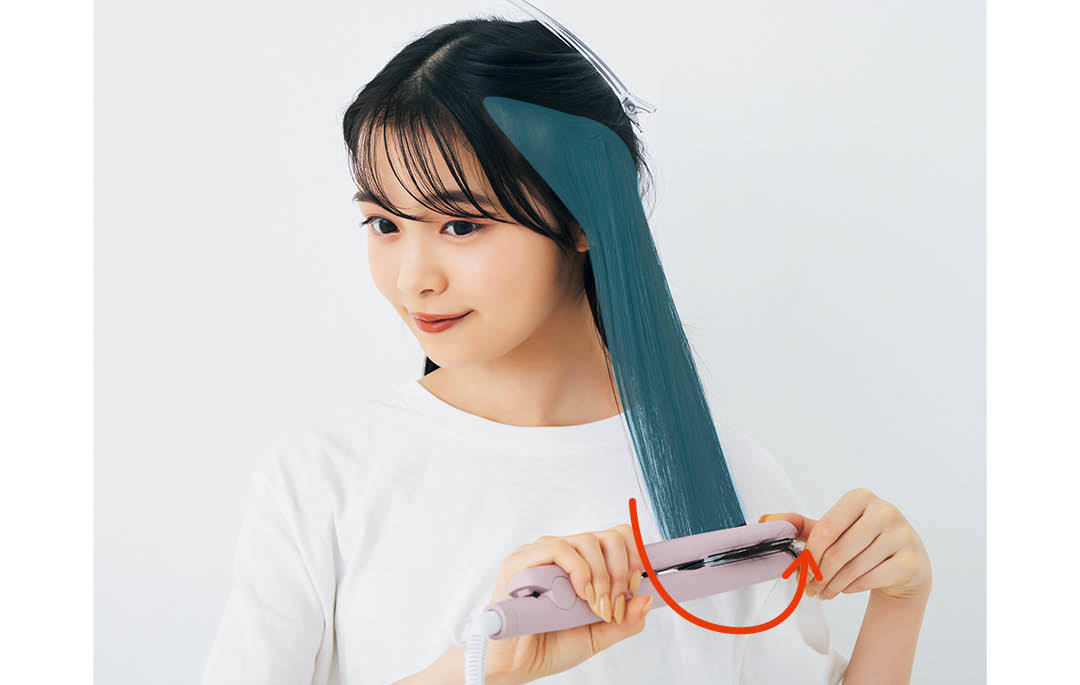 前髪とサイドの髪の"橋渡し役"になっている顔回りの毛束を取り、アイロンで縦に挟み、手首を前から後ろに返してリバース巻きに。