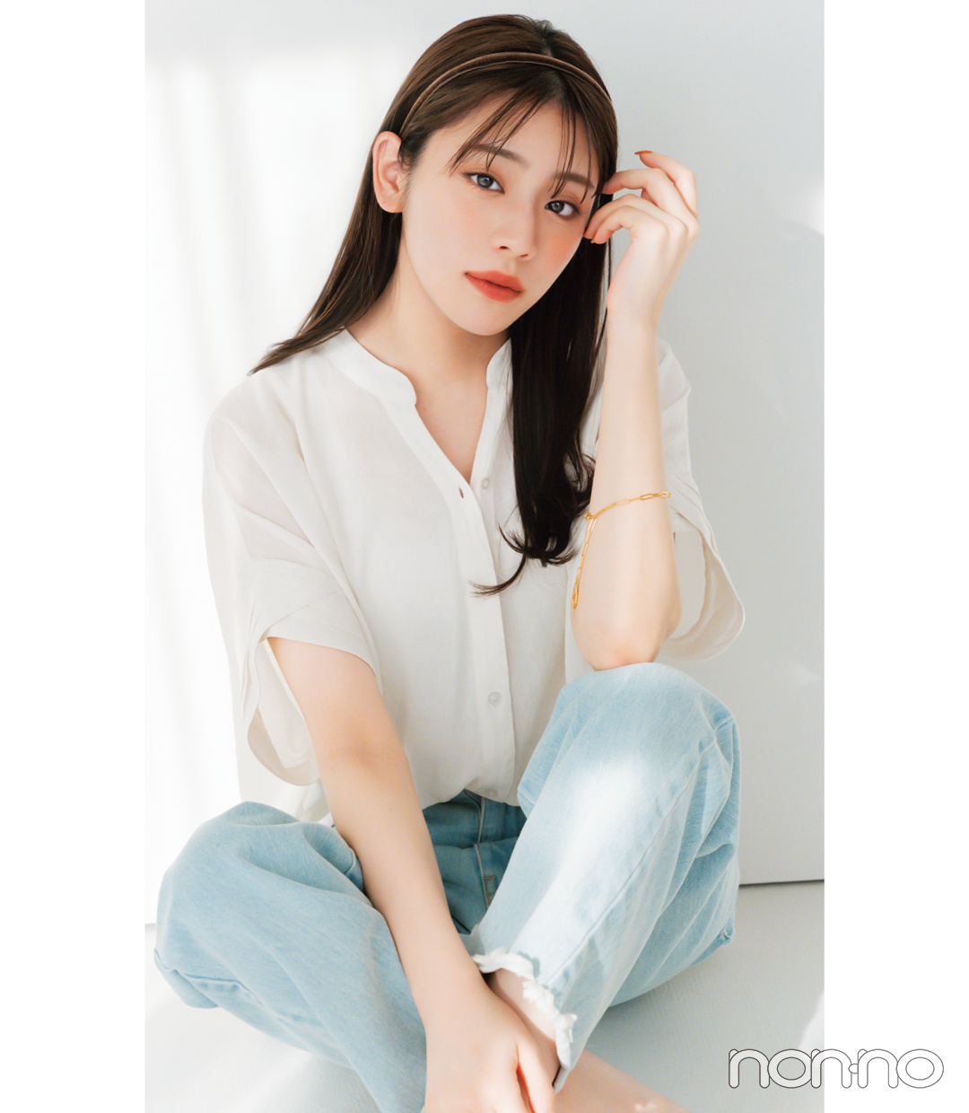 ブラウス¥4990/クラフト スタンダード ブティック プレスルーム パンツ(参考商品)/オリーブ デ オリーブ カチューシャ¥5830/THE HAIR BAR TOKYO(ジェニファーオーレット) ブレスレット¥4400/キャセリーニ(ラピュイ)