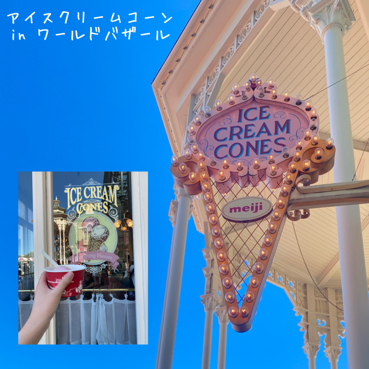 真ん中の写真は、ワールドバザールの「アイスクリームコーン」というお店で購入した、ストロベリーとピーチシャーベットのアイスクリームです!