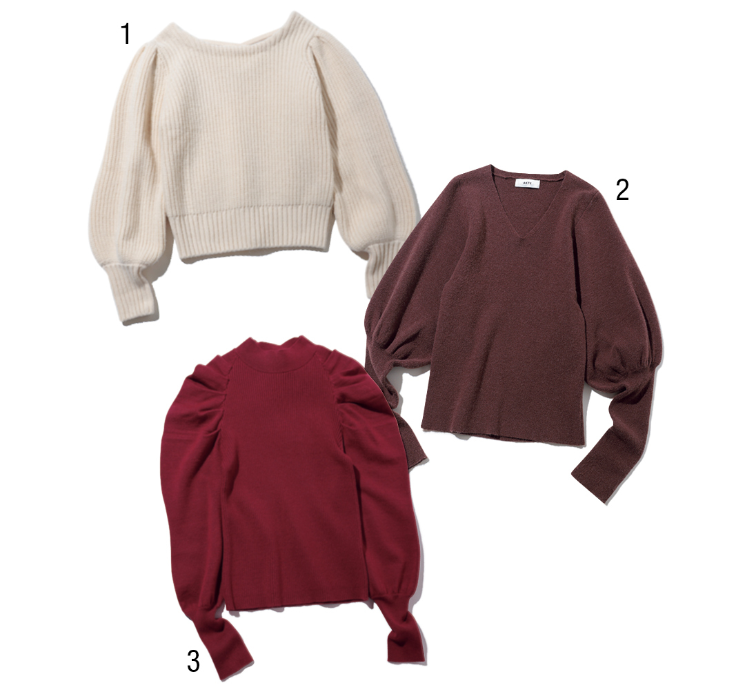 ケーブル編みのパフスリーブが主役。スクエアネックで品よく肌見せ。