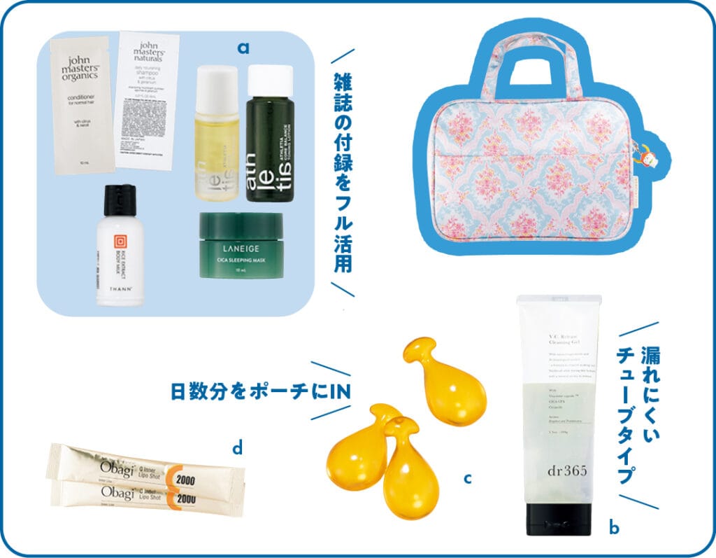 a 基礎化粧品やシャンコン、ボディクリームなどは、雑誌の付録やサンプルを活用。