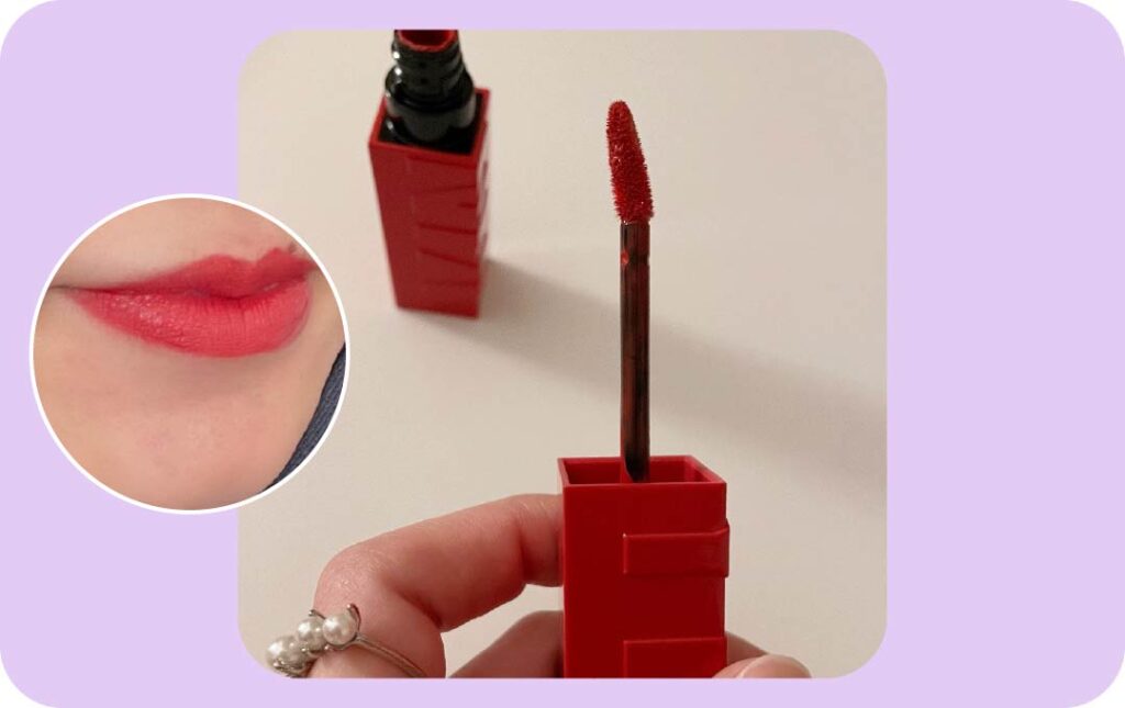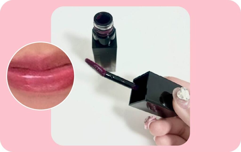 落ちにくいと話題のリップからブルべ冬にぴったりな鮮やかな赤を発見! シャカシャカ振るのが珍しいこちら、きれいに塗るためにはコツが必要。液をのせたチップをキャップのふちでしごいて量を調整した後、ティッシュオフして乾いた状態の唇に、スピーディーにさっとのせるのが成功のポイント!