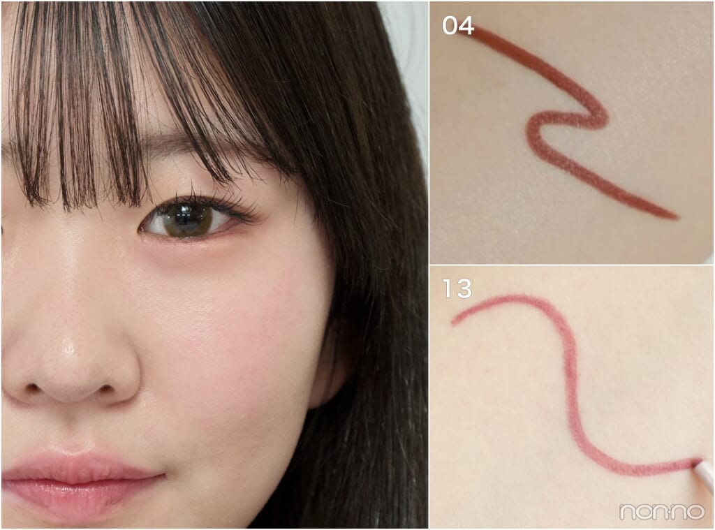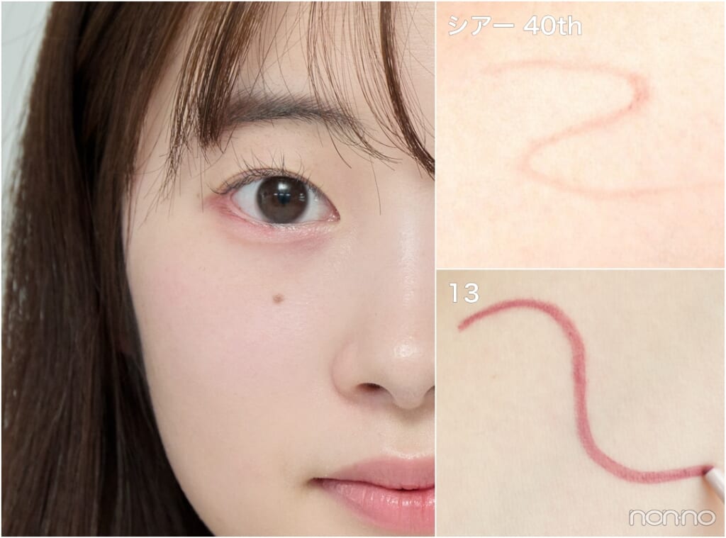 すごく好きな色味ではあるものの、粘膜拡張ラインとして使うとブラウンっぽさが目立って見えました。「13」の代用になるかと言われたらちょっとむずかしい……。薄めに描いてぼかしたり、上から赤みのあるアイシャドウを重ねたらちょうどいい色合いになりそう!