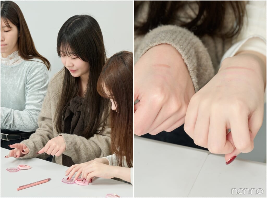咲希さん:(手の甲で試しながら)すごい、力を入れなくてもするする〜ってきれいなラインが描けるんだね。色も絶妙なピンクで可愛い!