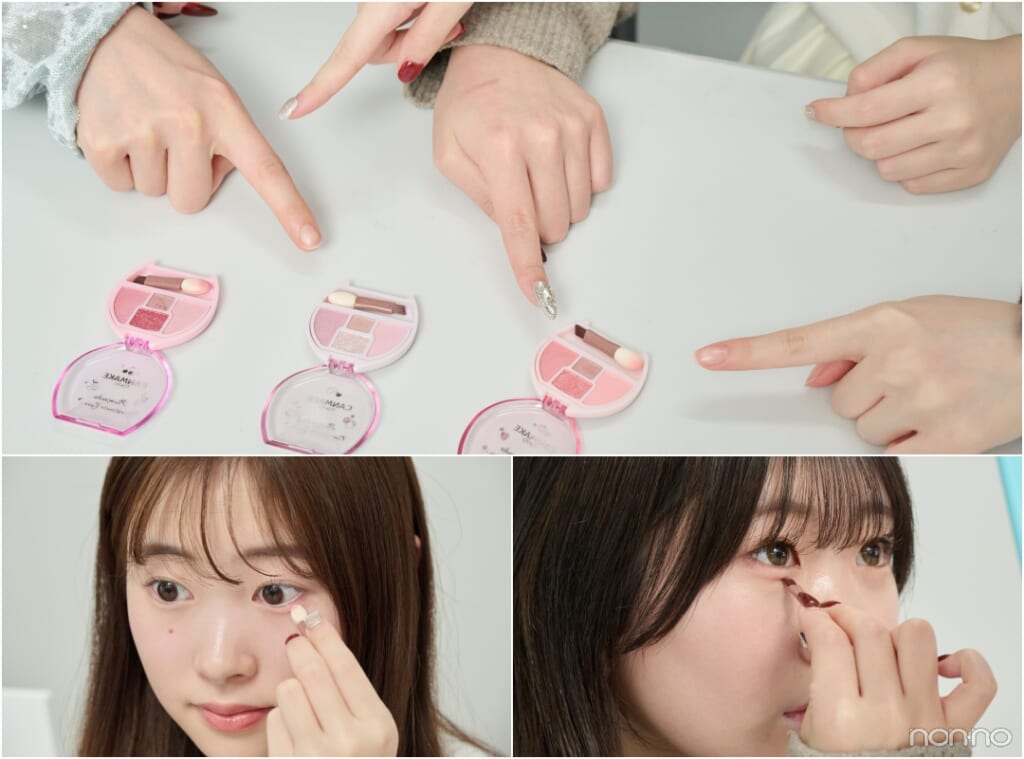 咲希さん:いつもは自然な仕上がりを目指してベージュ系を使っていたから、涙袋と粘膜ラインにピンクを使うのって新鮮。目ヂカラがグレードアップして、中顔面が短く見えるのがうれしい♡