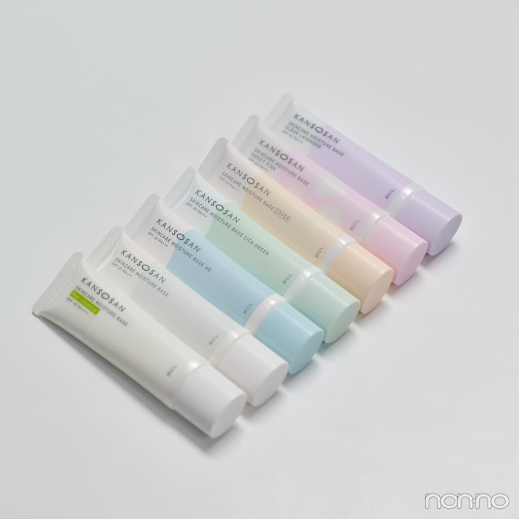 (写真手前から)乾燥さん 保湿力スキンケア下地 ノンケミ SPF45・PA++++(限定品・2026年4月7日より定番化予定)・同 保湿力スキンケア下地 SPF37・PA+++・同 水分力スキンケア下地 SPF42・PA+++・同 保湿力スキンケア下地 シカグリーン SPF45・PA+++・同 保湿力スキンケア下地 カバータイプ SPF40・PA+++・同 保湿力スキンケア下地 スウィートピンク SPF45・PA+++(限定品)・同 保湿力スキンケア下地 透明感ラベンダー SPF45・PA+++ 各30g¥1430/BCLカンパニー