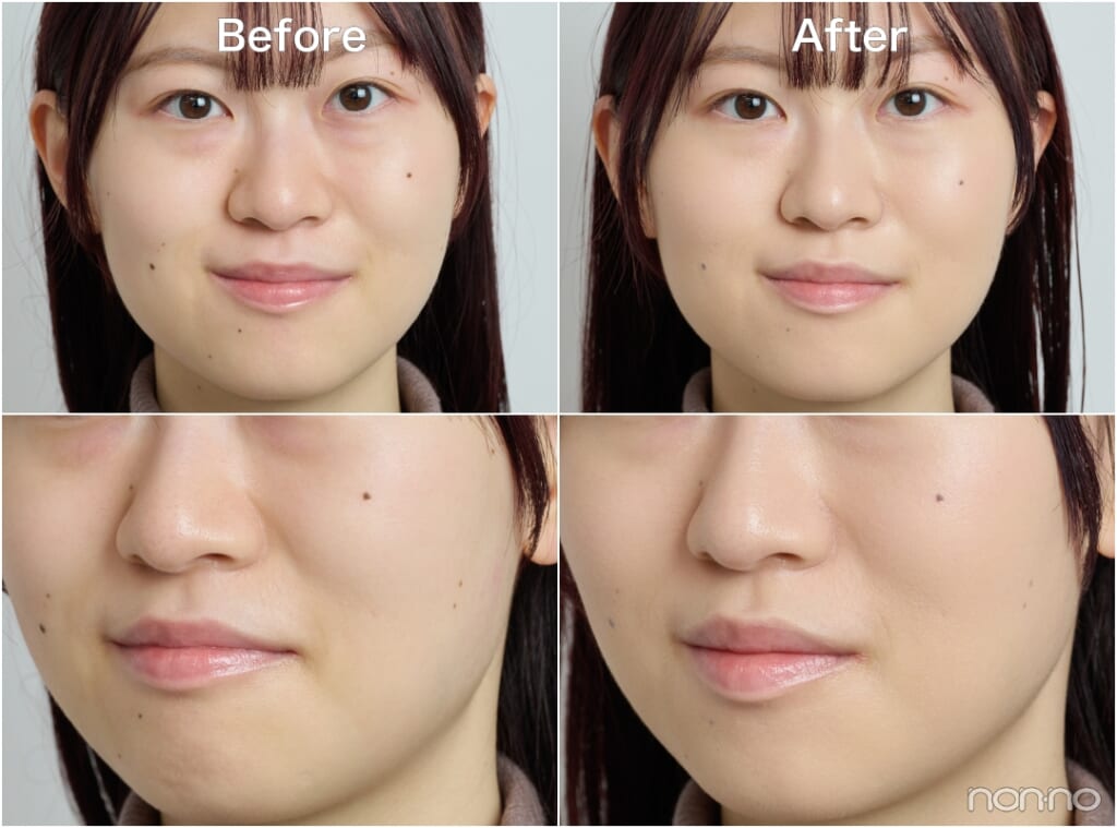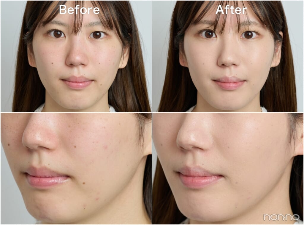 気になっているフェイスラインのニキビが薄くなるほどのカバー力に感動。時間がたっても粉っぽさを感じず、保湿感が続いてファンデが密着している感覚が。ただ液量を調整せずにつけてしまったのもあり、テカリやすい小鼻と頬あたりにややメイクくずれが。薄く仕上げるのがポイント!