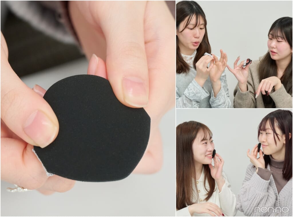咲希さん:クッションファンデのパフって、液体を吸収しすぎて何度も押し当てないとつかないものがあるけど、これは軽く押し当てるだけで液体がたっぷりついてくれるね。あえてそういう作りになってるのかな?
