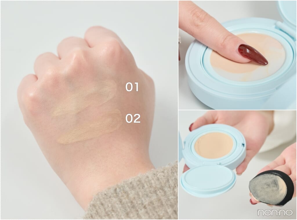りんさん:「02」はふわっとしたピンクみがあってきれいな色! よりカバー力がある印象かな。