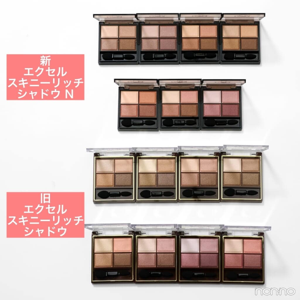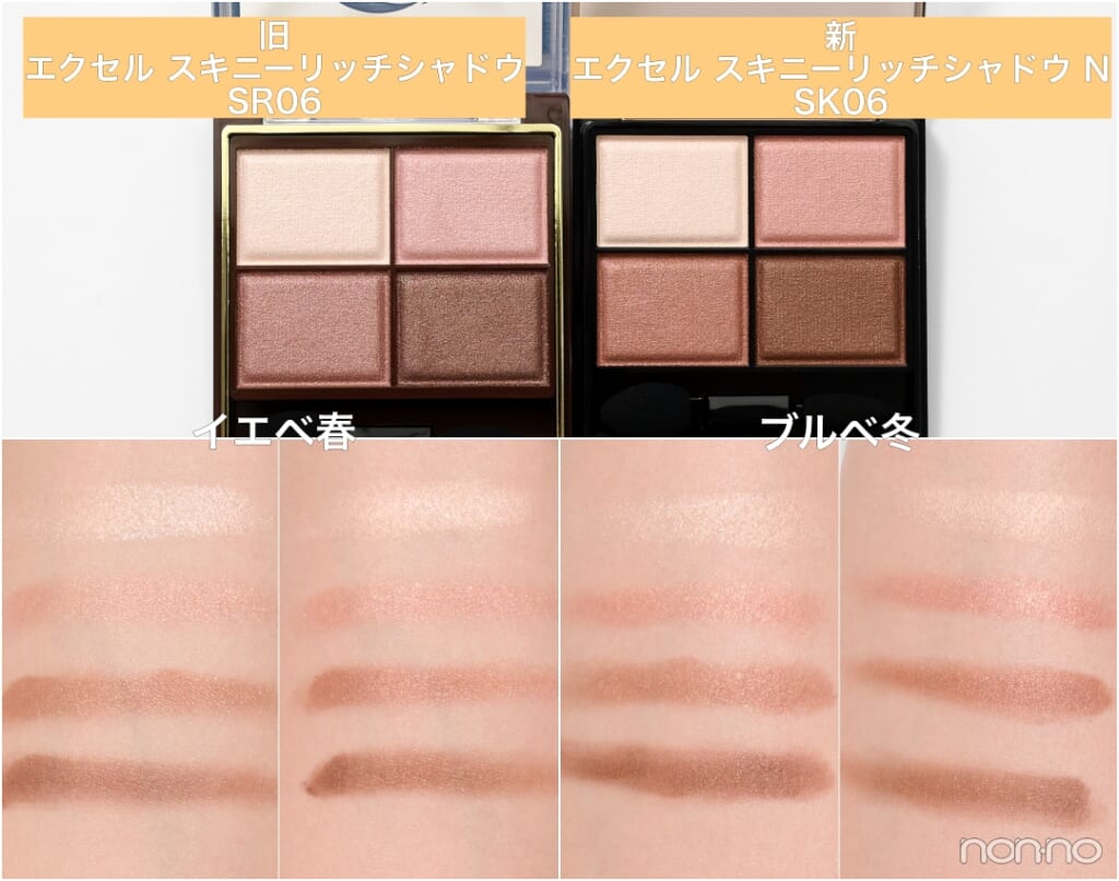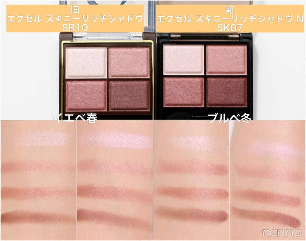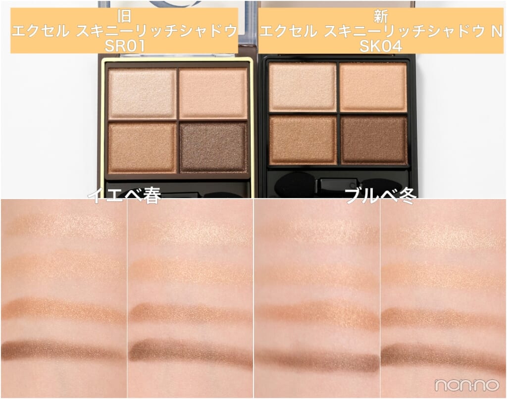 連載第4回は『エクセル』。パワーアップした捨て色なしの4色パレット「スキニーリッチシャドウ N」を、イエベ&ブルベのパーソナルカラー別に全色レビュー。旧製品との色比較もあわせて要チェック!
