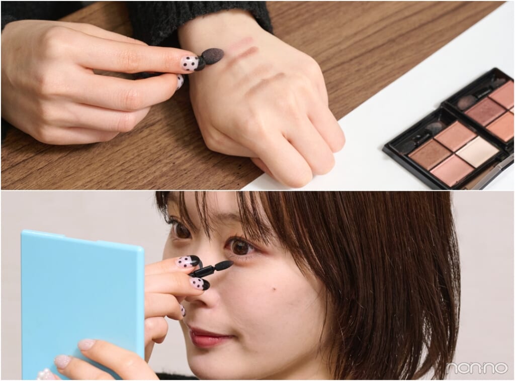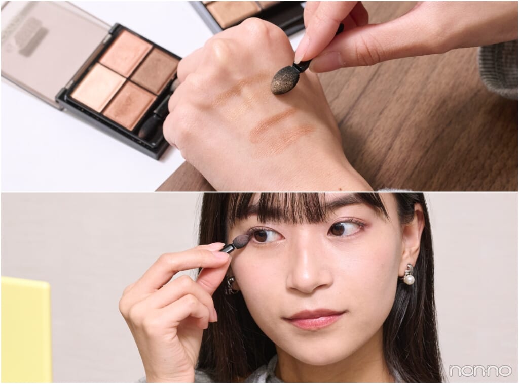 見た目は黄みが強く感じましたが、まぶたにのせるとピンクのツヤめきが生まれてキレイになじみます。右上のピンクニュアンスカラーを多めにのせ、右下のブラウンをグラデーションさせると優しげな印象に!