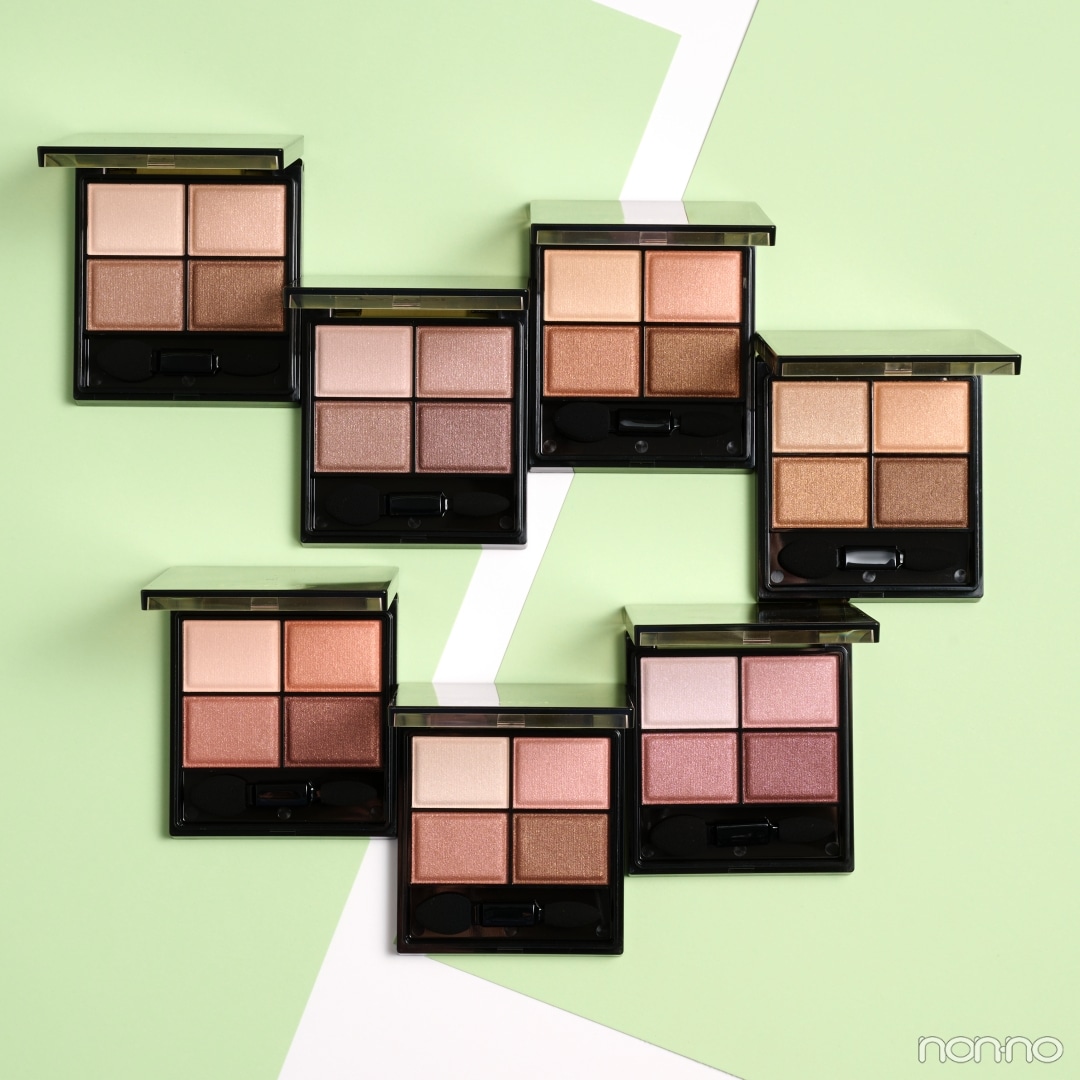 イエベ・上杉さん:左上は目元を明るく整えるトーンアップベースカラー、右上は輝度の高いパールを配合したニュアンスカラー、左下はワントーン深みのあるニュアンスカラー、右下は旧製品よりも少し発色をやわらげたシェードカラー……だって。