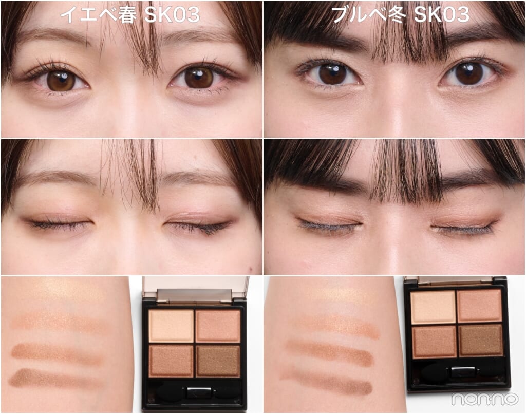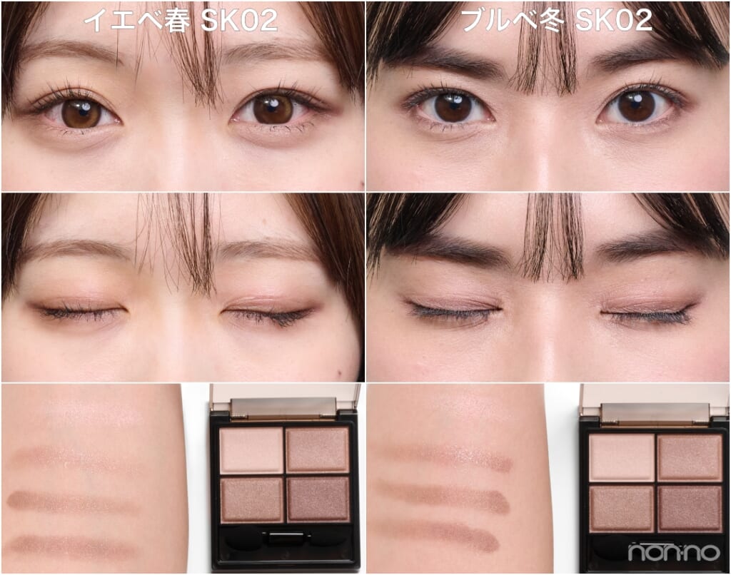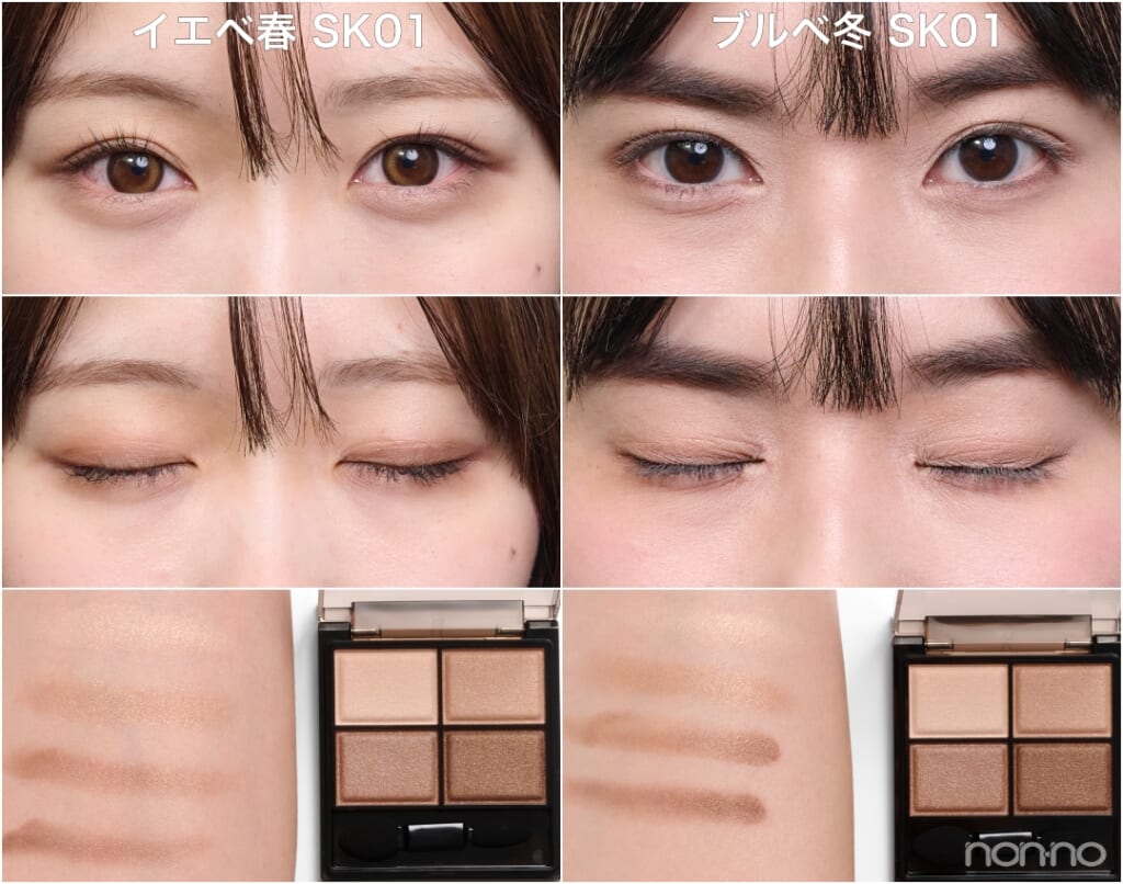 ブルベ・杉山さん:(手の甲で試しながら)ニュートラルな「SK01」はかなり薄づきだから、アイシャドウをあまり濃く見せたくない日によさそう。オレンジ系の「SK05」はイエベ向きかな?