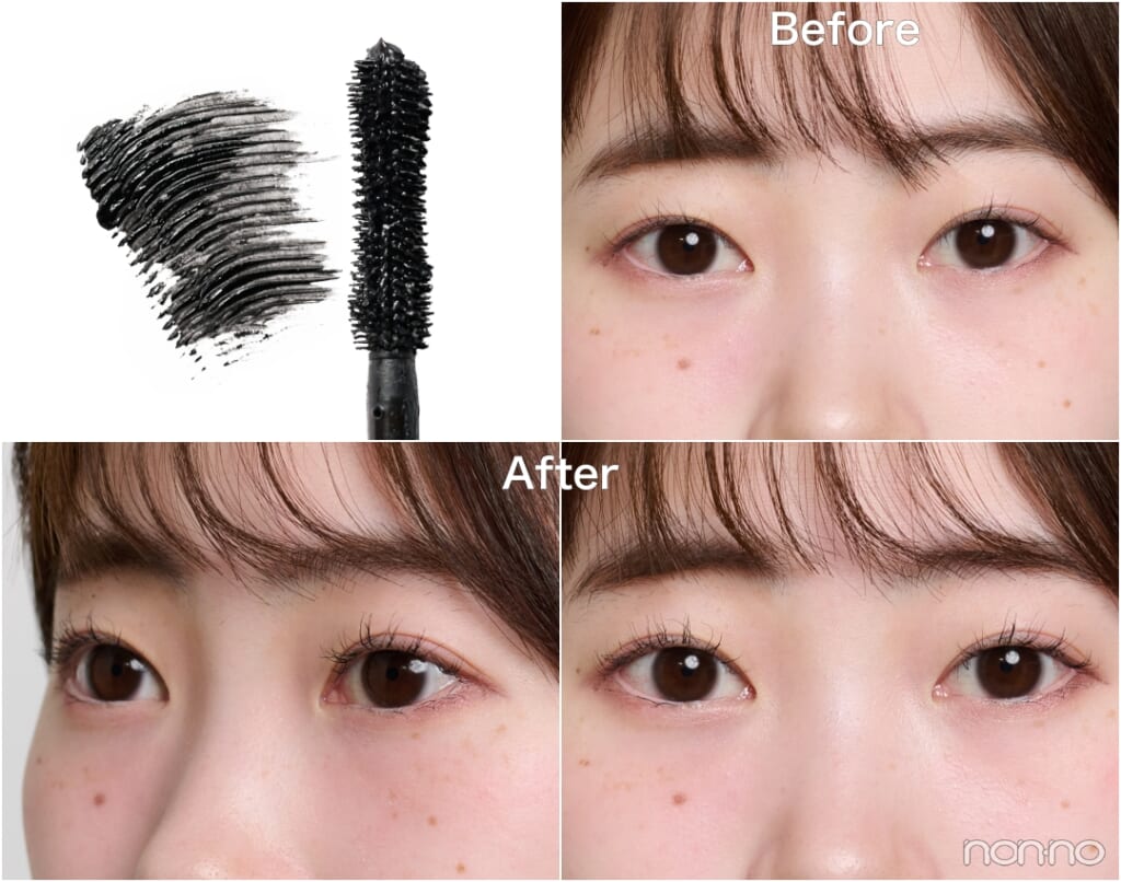 これまでの仕上がりの概念を覆す大きなポイントは、高密着ジェルを配合した新感覚の“ジェル状フィルム液”。まつげの根元にピタッと密着&そのまま毛先に向かって塗布するとジェルの形状がほどけ、凹凸補正効果のあるフィルム膜がつるんとなめらかにフィックス。従来のマスカラ液は凹凸補正効果がなく毛先まで均一な厚みでつき、それゆえに全体的なボリュームや長さを出すにはうってつけだったそうですが、今回の新シリーズではまつげの1本1本に存在感を与える仕上がりを追求! たゆまぬ企業努力のおかげで根元は太く、毛先に向かってスッと先細りになる美しいフォルムが完成したのです。