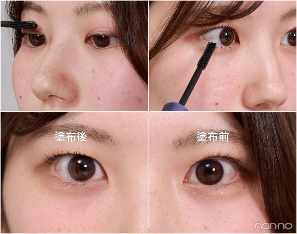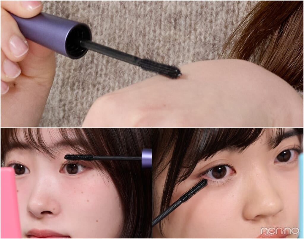 りんさん:まつげに長さがある人はブラシを横のまま塗っても大丈夫そう。私はブラシを縦にして、先端のカーブ部分を使って1本1本に塗るのがやりやすいかも。韓国アイドル風の、ピンセットでつまんだ風の束感も作りやすい♡