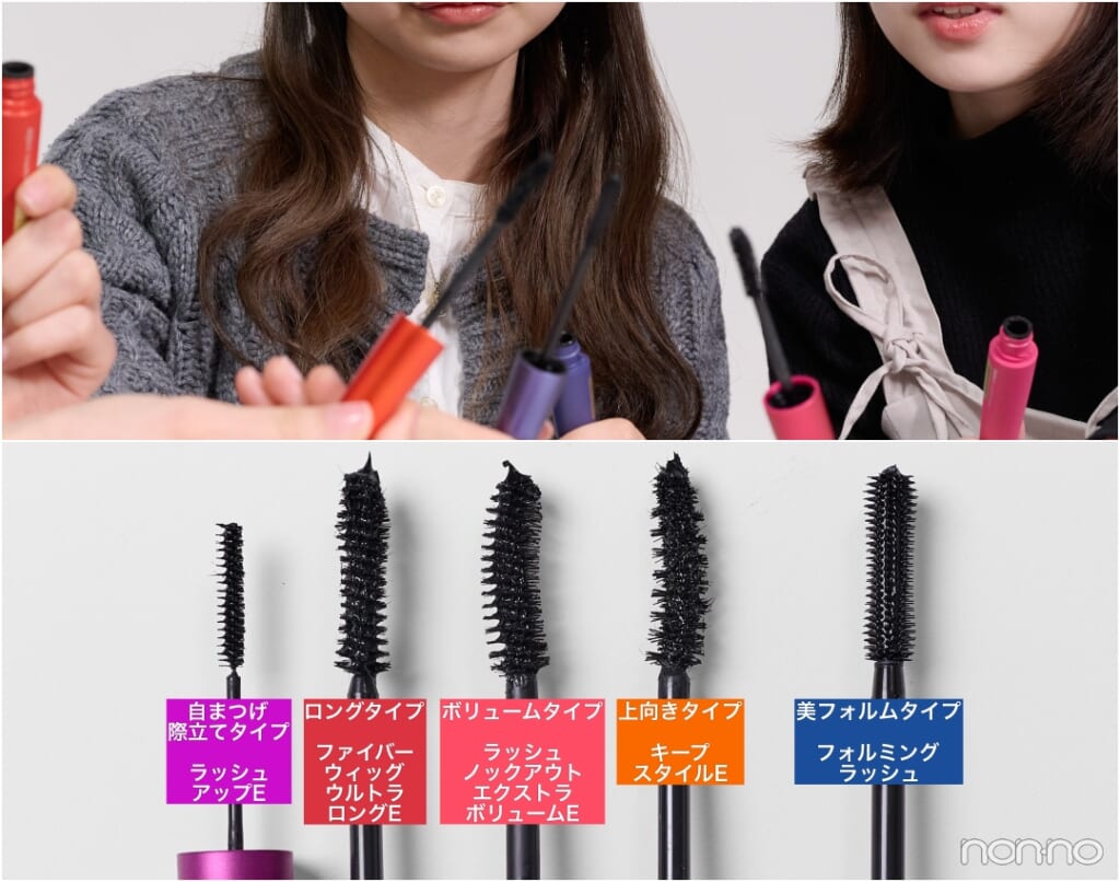 ちささん:並べてみるとブラシの形も大きさもまるで違うね。私は高校生の頃にまつげがボリューミーに仕上がるマスカラで失敗して以降、太さとボリュームを出せるタイプに苦手意識が生まれちゃってさ。この中だったら「ラッシュアップE」と「フォルミングラッシュ」が好みだなぁ。