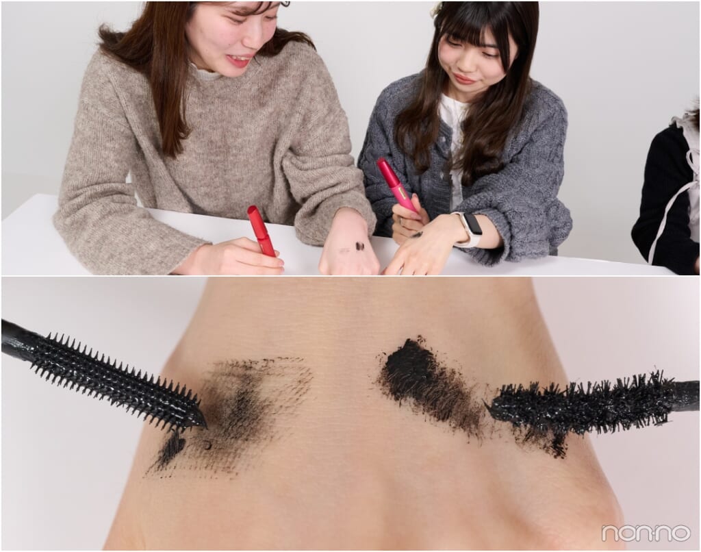 咲希さん:手の甲に出したテクスチャーは「フォルミングラッシュ」が一番サラッと軽やかに感じるよね。それ以外のマスカラも決して重たいわけじゃないんだろうけど、なぜかペタッと粘度が強く感じるというか。毛のブラシよりもシリコンブラシの方が液量の調整がしやすそう!
