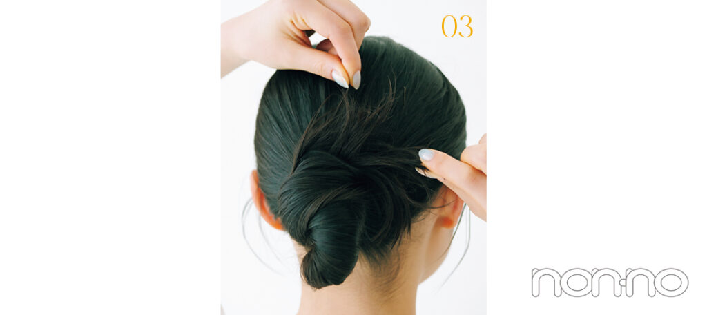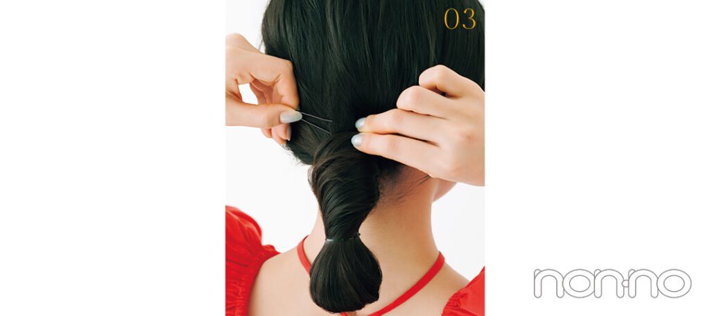 結び目を押さえて毛束を少量引き出したら、結び目にぐるっと巻きつけて、ピンを埋め込むように留めよう。