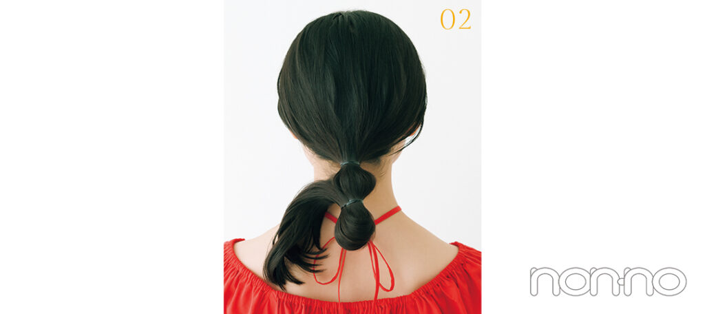 01で作った結び目の3cmくらい下をゴムで結び、2つの小さいおだんごに。毛先は引き抜かずに折り返そう。