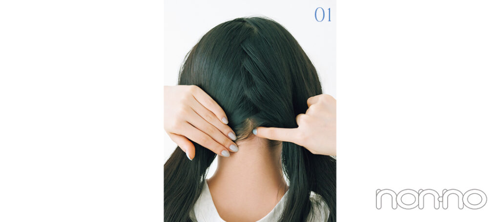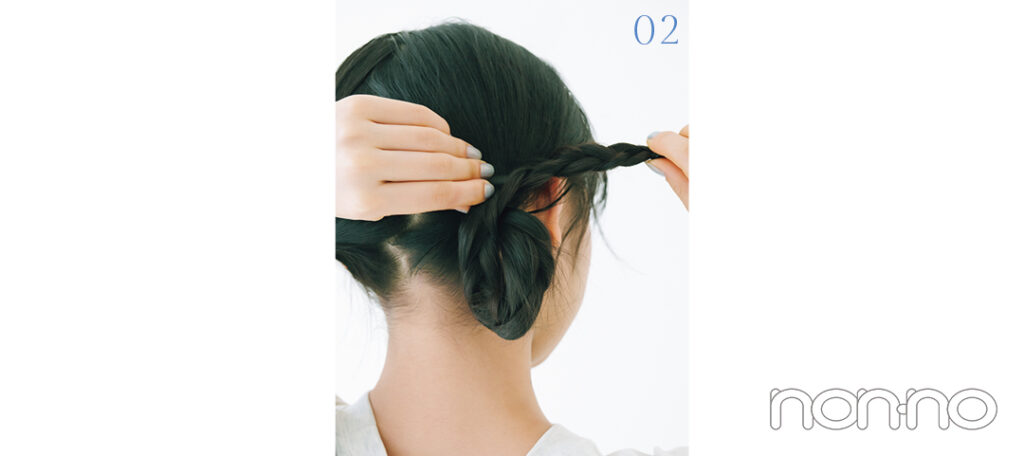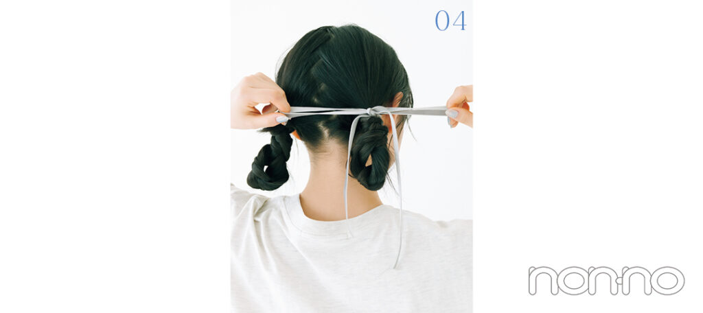 01で分けた髪を左右それぞれ三つ編みにして、毛先に近い位置をゴムで結ぶ。毛先を持って、根元に1回転巻きつけよう。