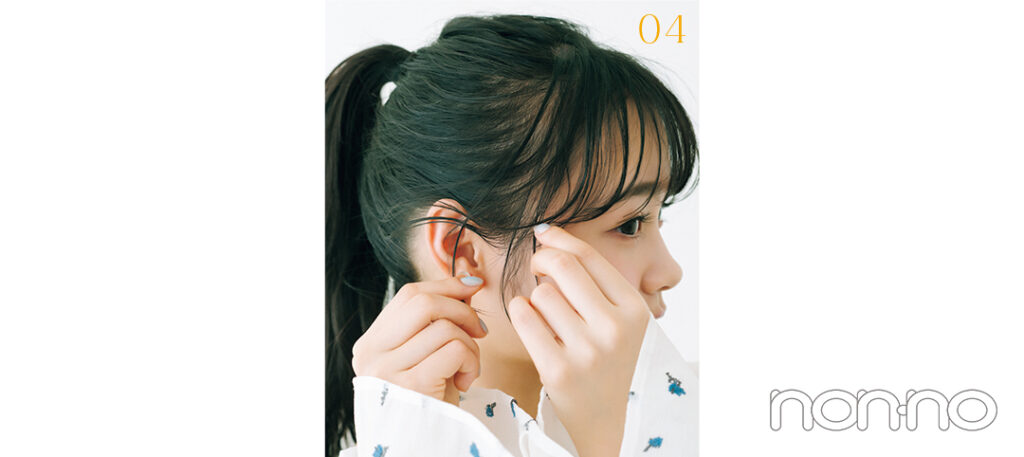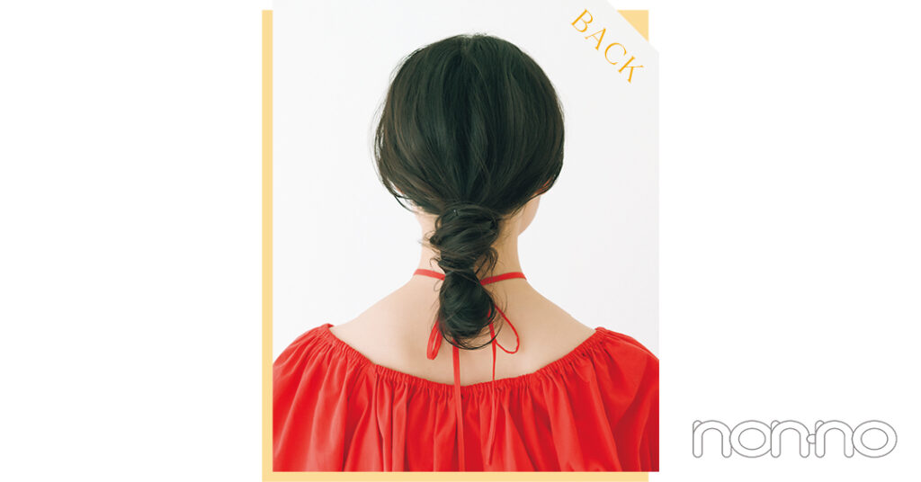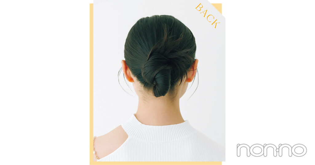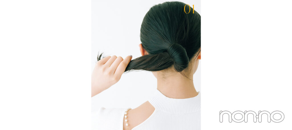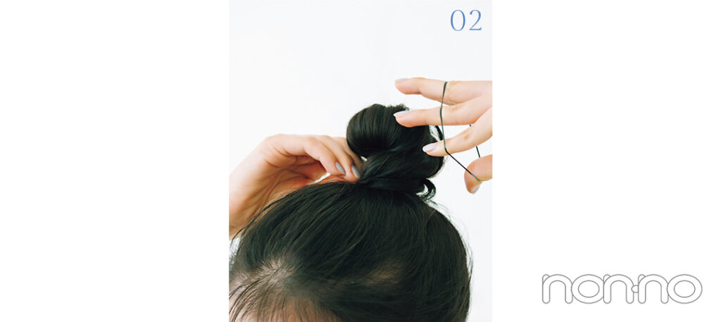 前髪を7対3くらいに分けたら、低めの位置で毛先を引き抜かず"輪結び"にする。その後、毛束を根元にぐるりと巻きつけて。