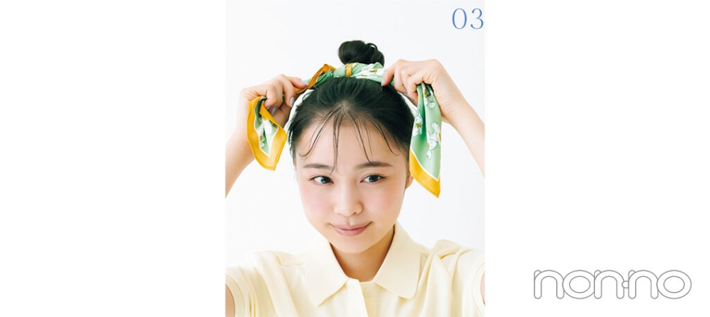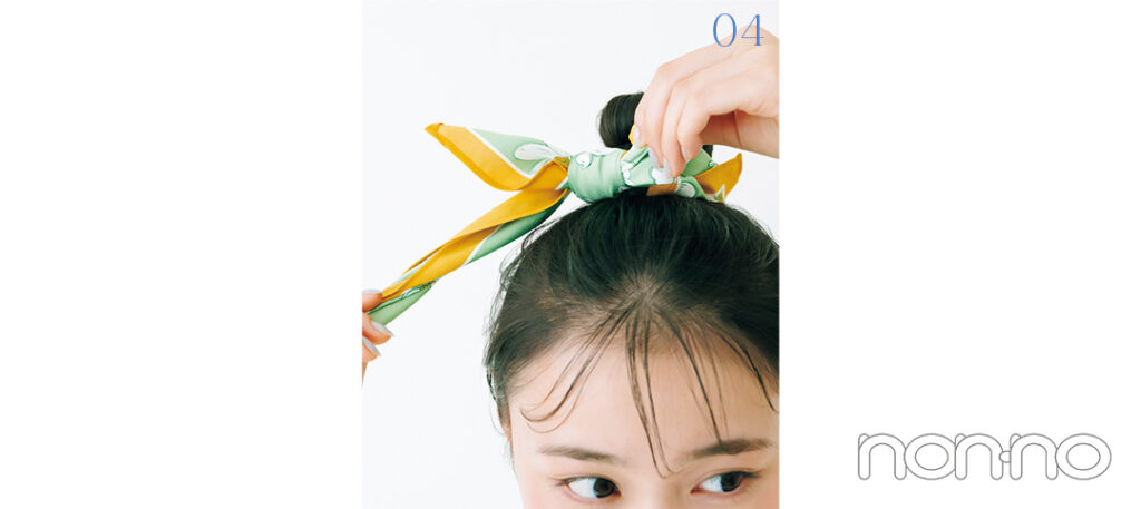 春夏にぴったりな爽やかアレンジといえば、おだんご! スカーフを使うと今季仕様に。トップスと同系色を選べば色合わせも簡単で◎。