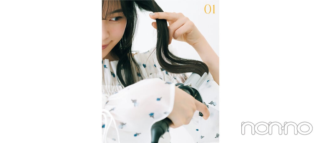 毛束を取り、直径32mmのアイロンで内→外と交互にカール。隣の毛束は外→内に変えて巻く方向をミックス。