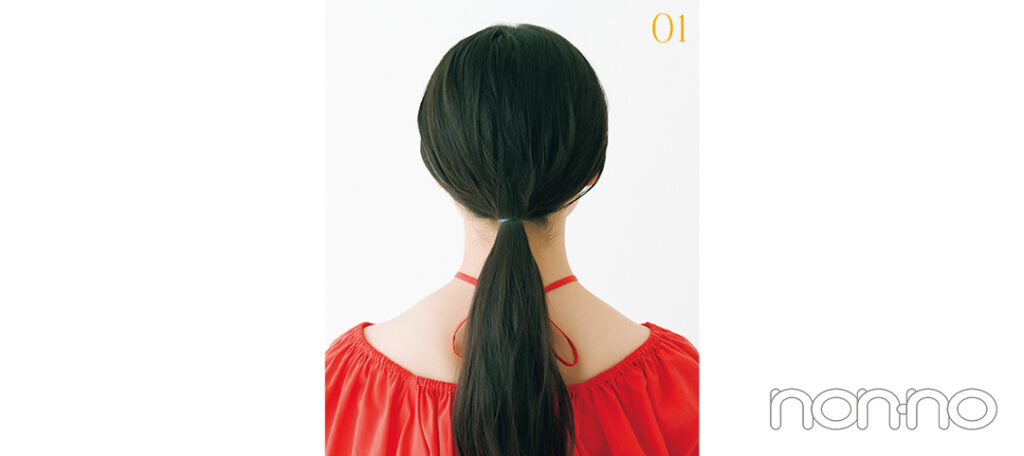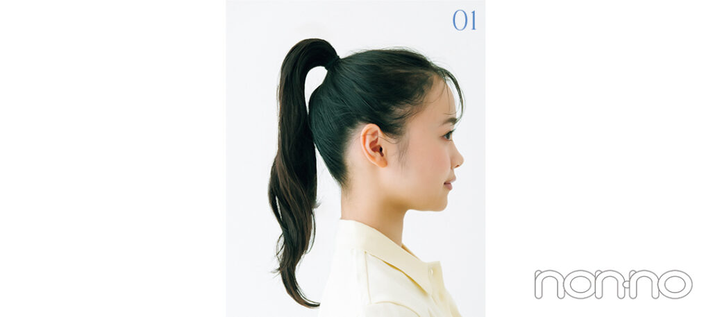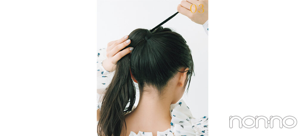 まずは頭頂部に近い高めの位置でポニーテールを作る。後から崩れることのないように、しっかりと結んで。
