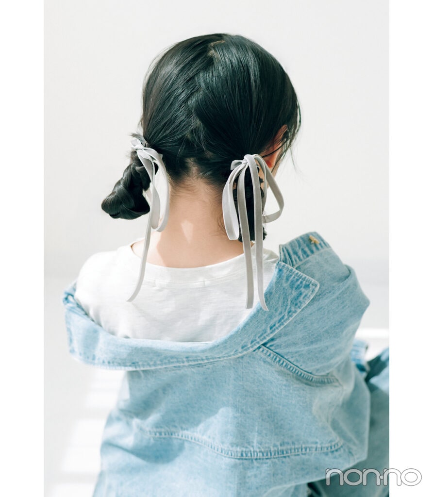 あえてカジュアル服にも合わせたいスウィートなツインアップ。グレーなど落ち着いた色のリボンで大人っぽさもキープ!