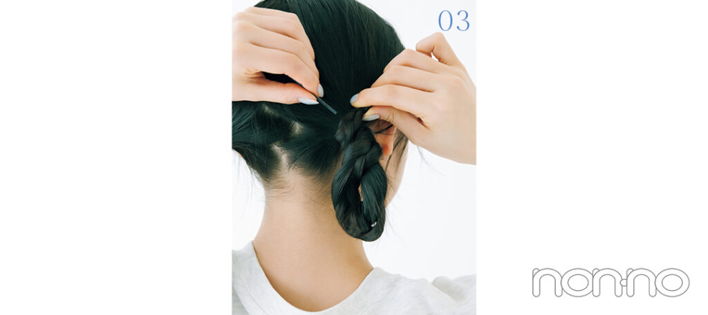 さらにもう1回転巻きつけたら、ピンで毛束を固定。外れないように、三つ編みの始点の位置にしっかりと留めるのがコツ。