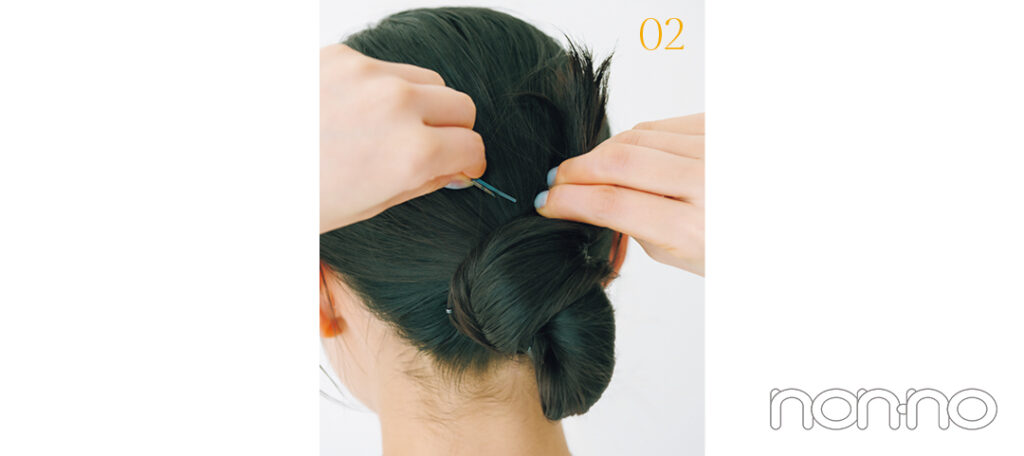 毛先を上のおだんごに巻きつけてピンで留める。結び目を押さえ、表面&おだんご部分の毛を軽く引き出して。