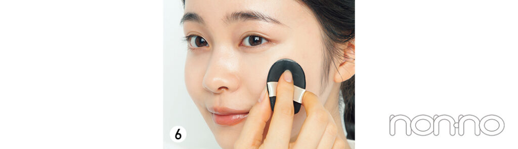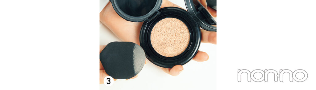 クッションファンデはパフ上側の1/3を目安に取る。これで片頬分。