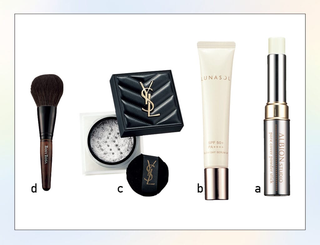 おでこ、小鼻など皮脂崩れしやすい部分にaをのせてテカリと毛穴落ちを予防。
