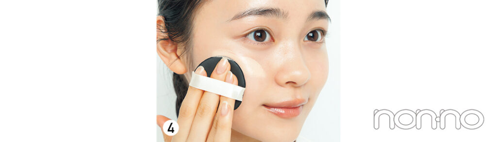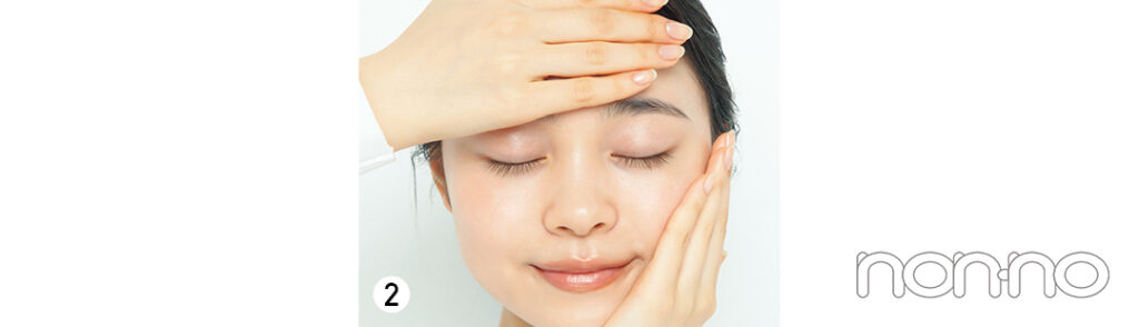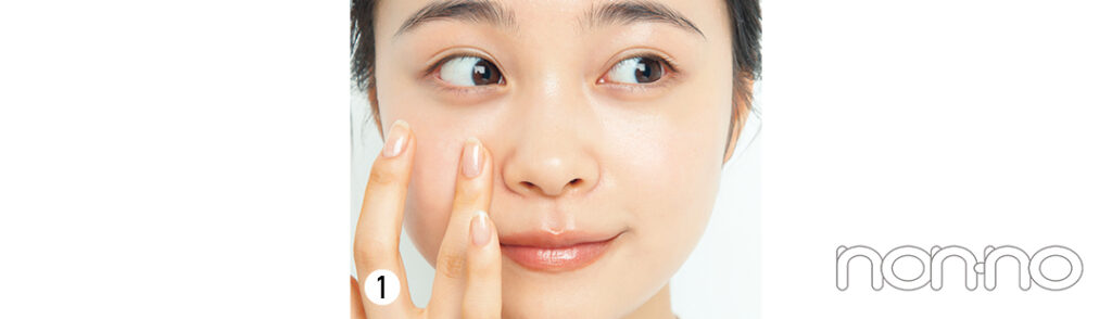 bの水分たっぷりの下地を全顔にのせた後、手のひら全体で塗り広げる。
