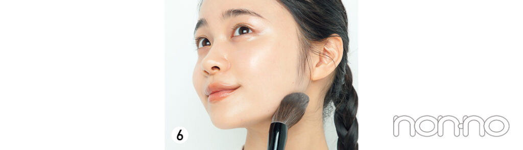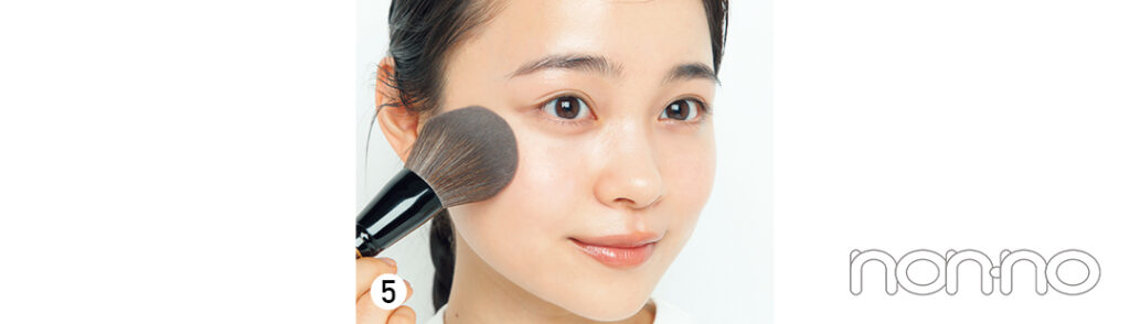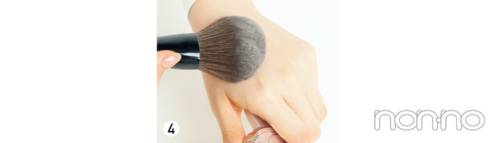 ④で粉量を調節したブラシで、顔の中心から外へ向かって全体にパウダーを。