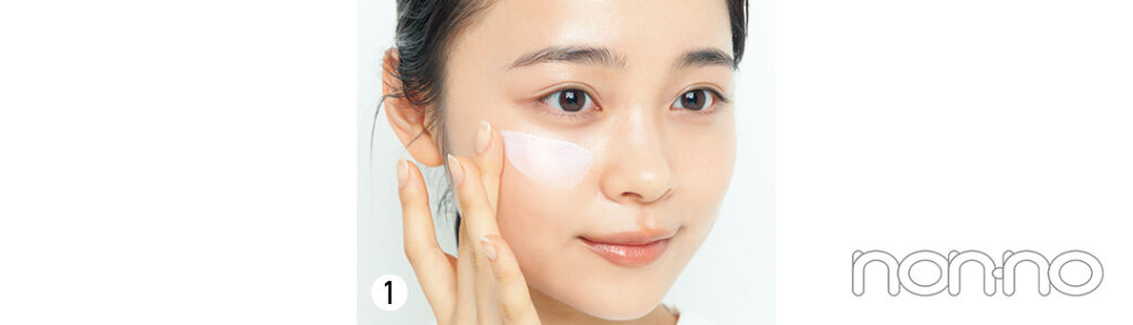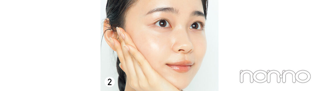 下地はフェイスラインやアゴ下、首の境目まで手のひらでなじませて。