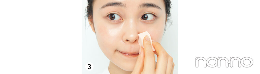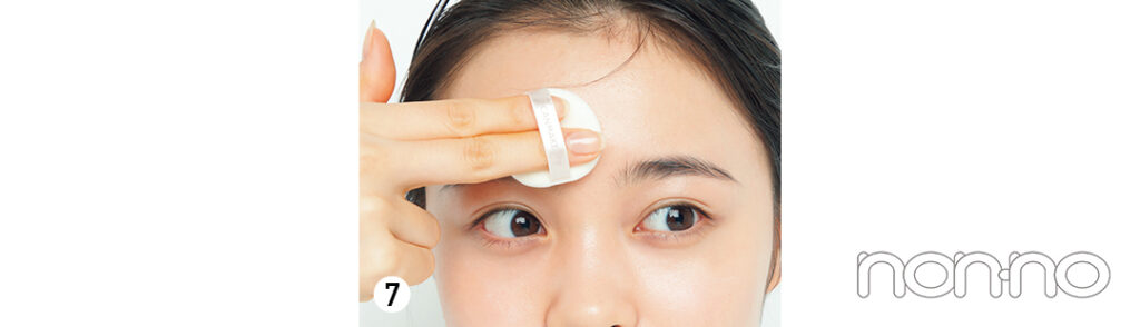 パウダーに付属のパフを使って、テカりやすいおでこや小鼻などを押さえる。