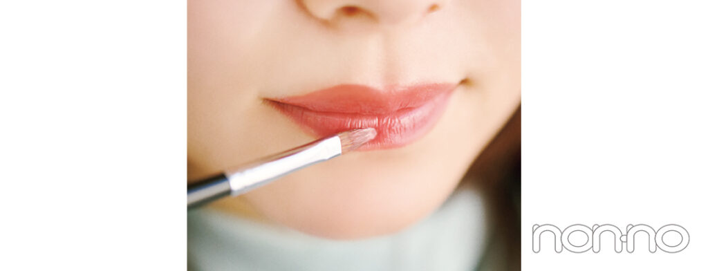 リップブラシで6を取り、リップラインより少しはみ出すようにきちんと塗る。何度か重ねて発色を高め、鮮やかに。