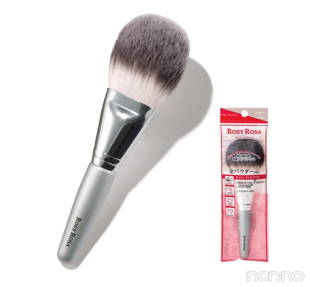 毛が柔らかく、使い心地のいいファン(うちわ)型ブラシ。あらゆるパウダーに使うことができ、メイクの幅も仕上がりも格段にアップ! お手入れしやすいPBT毛を使用。ソフトカバーつき。¥1210/ロージーローザ