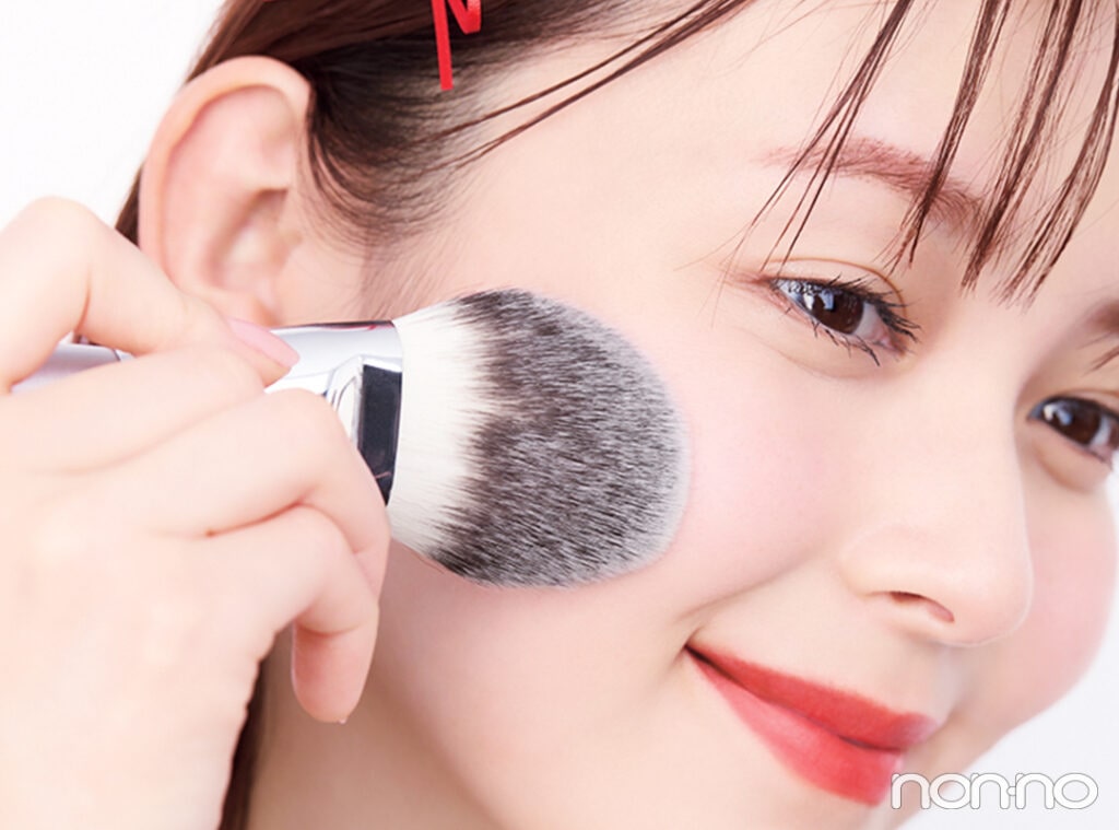 側面を肌に当て、そっとなでるようにパウダーをオン。なめらか質感のブラシで、フォギーな肌が簡単に出来上がり!