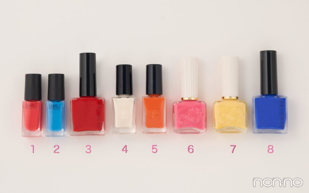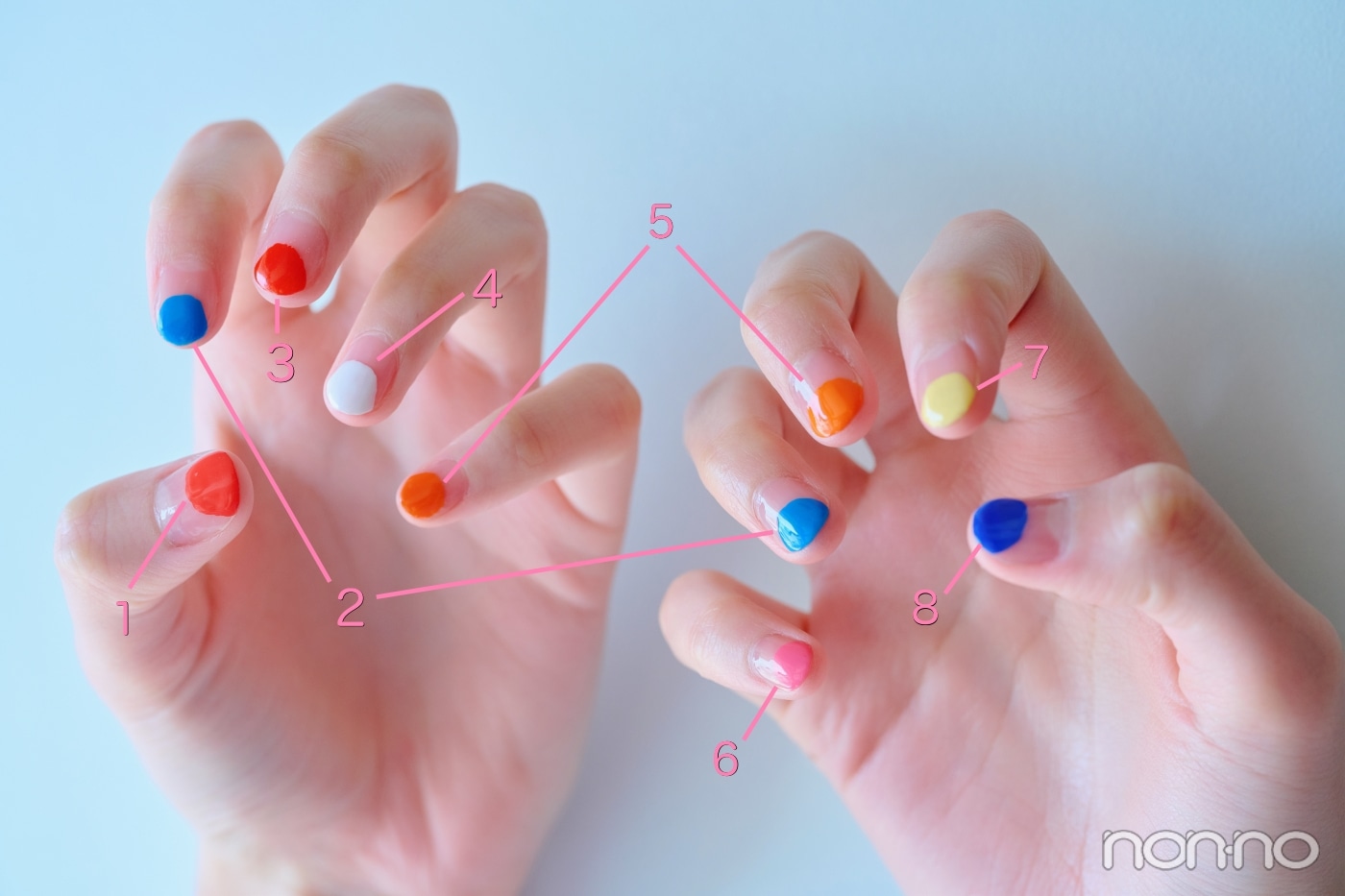 色とりどりのネイルをチョイス! 白やパステルイエローを混ぜると原色のネイルが引き立つよ。