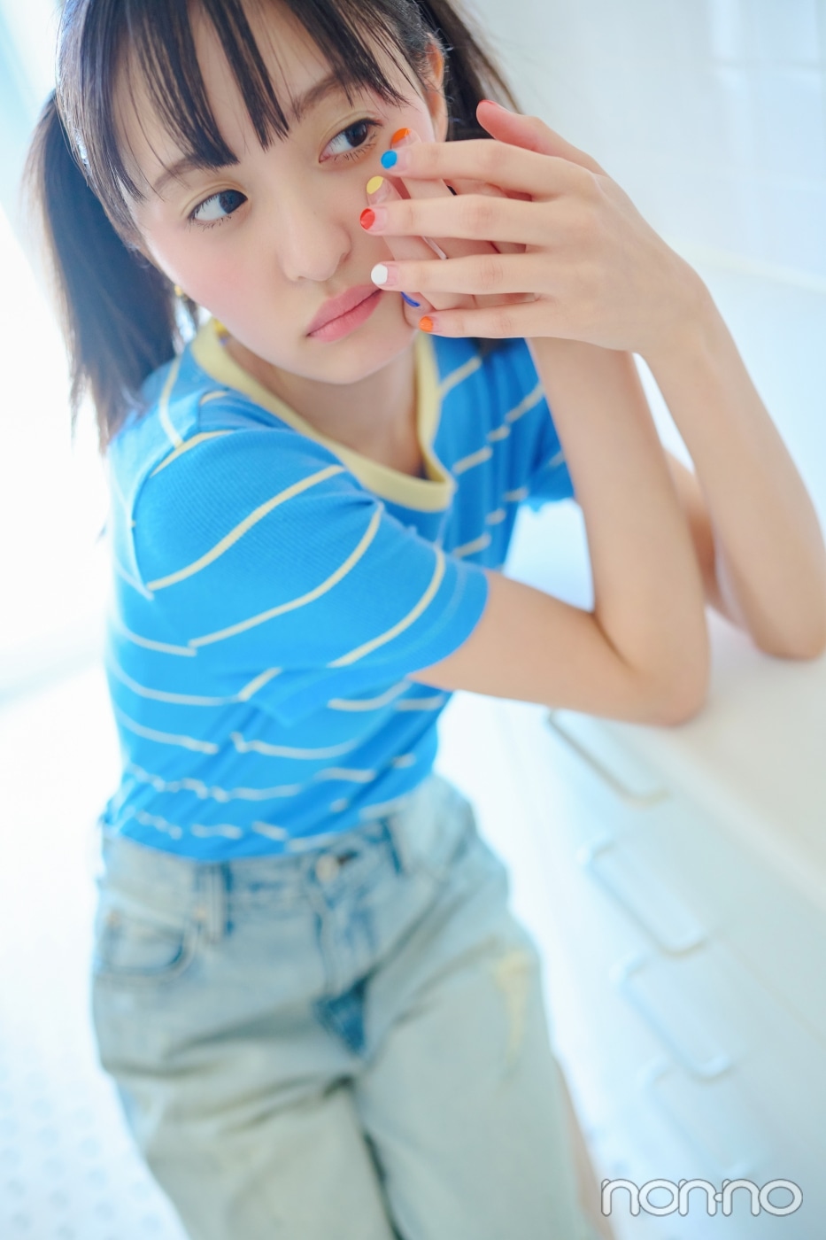 さくらが着たのはブルー&イエローのボーダートップス。トップスのカラーをネイルにも取り入れて、さりげないリンク感を。