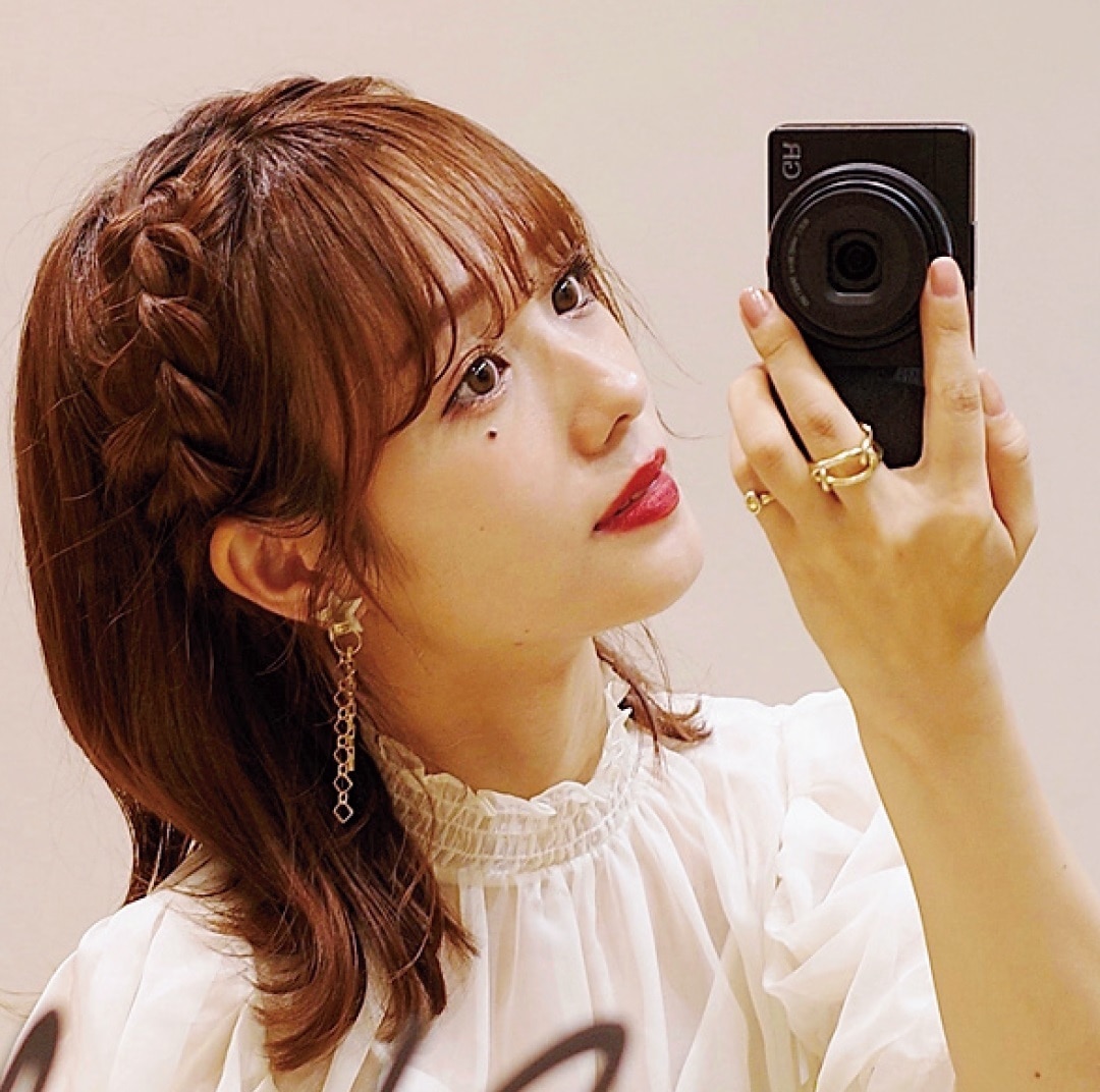 「全体を軽く巻いた後、センターからやや右寄りで毛束を取り、左側に持っていき編み込んでいく。耳の位置まできたら、ピンが見えないように固定して。逆側も同じように。YouTubeに詳しくのせているので、チェックしてみて♡」