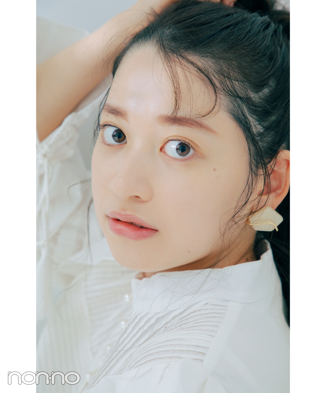 両ほっぺと鼻筋をチークでつなげることで、顔全体に一体感が出て、目線を鼻からずらせる上に、天使なムードに♪