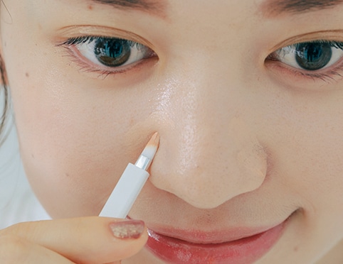 小鼻が張った人は、くすみや毛穴を整えるだけで影がなくなり存在感が弱まるよ。崩れやすい部分なので、2アイテム使って丁寧に仕上げよう。