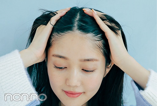 セラムを5プッシュ、髪全体をかき上げながらなじませベースのニュアンス作り。