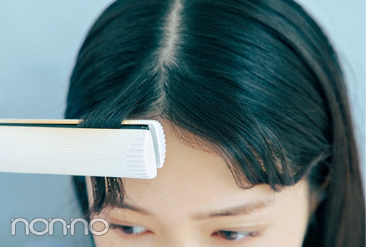 前髪の根元に近い部分に内側にテンションをかけて、立ち上げるようにクセづけ。