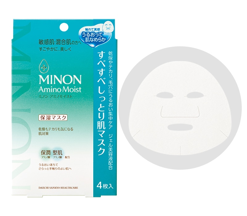 とろみのある美容液が肌を包み込み、みずみずしい肌に。スペシャルケアにも。ミノン アミノモイストすべすべしっとり肌マスク (22ml× 4枚入り)¥1320(編集部調べ)/第一三共ヘルスケア
